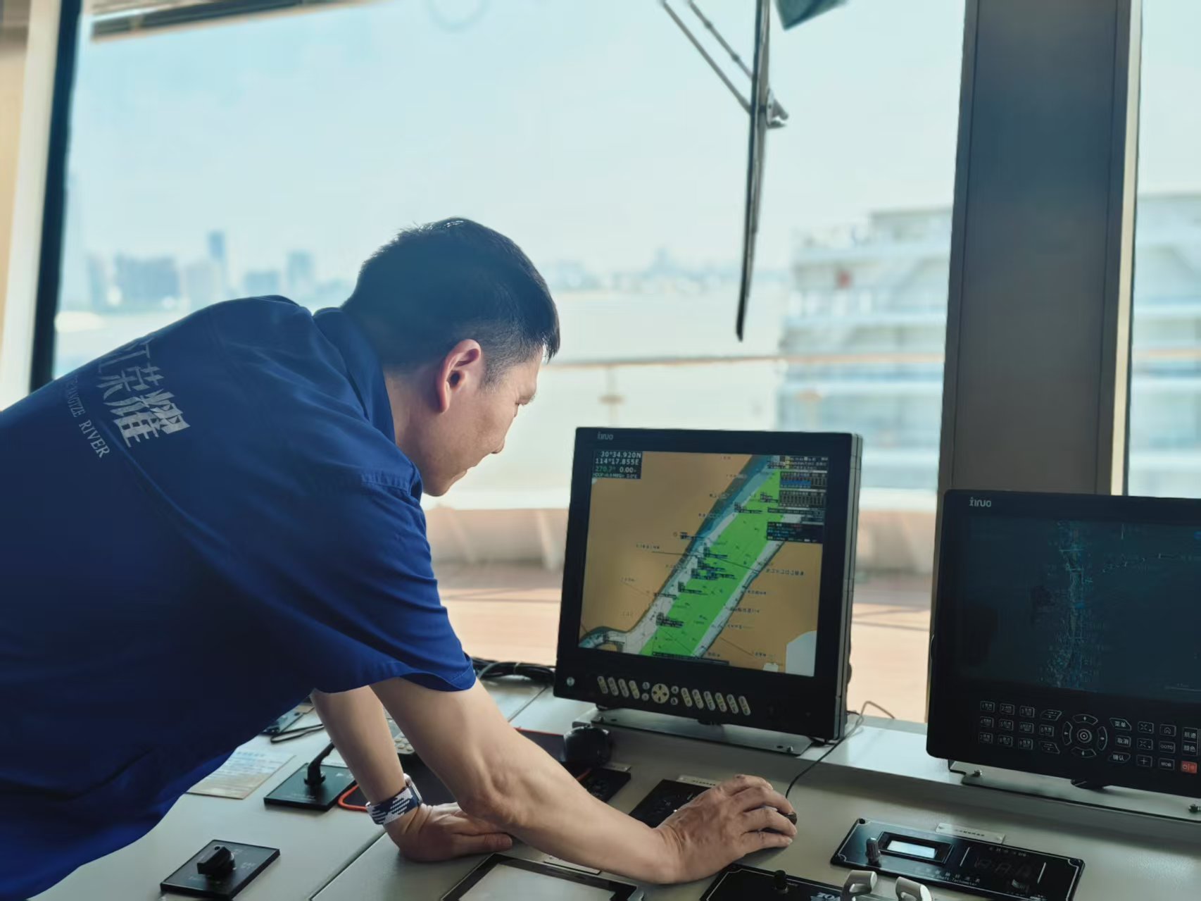 在游轮指挥中枢,该船大副向师生演示了全电力推进系统的精准操控。引航员现场解析:"电力推进不仅实现零尾气排放,其瞬时响应特性更提升了船舶在复杂航道中的安全性。"另外大副向我们介绍了先进的导航系统包括AIS(船舶自动识别系统),VDR(航行数据记录仪)等先进导航系统,同学们通过智能导航屏观察电子海图实时更新,对航运驾驶有了更深刻的认识。