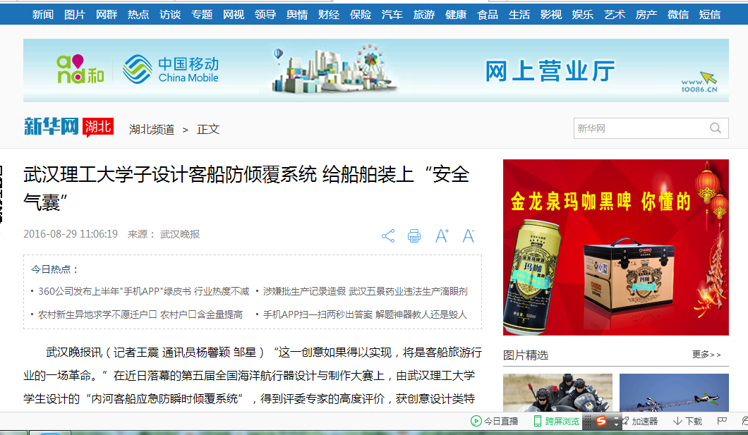 “6·1”东方之星沉船事件后,他指导团队员工围绕内河客船安全问题研发“内河客船应急防瞬时倾覆系统”,获得第五届全国海洋航行器设计与制作大赛“特等奖”好成绩。作品的创新性设计得到主办城市镇江电视台的采访,后续被武汉晚报、楚天都市报、新浪新闻、新华网、长江网、荆楚网等十多家报纸或网络媒体报道或转载,并得到了湖北电视台生活频道、教育频道邀约采访。