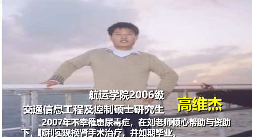 刘敬贤教授将研究生指导工作看作一门艺术,在日常教导中注重严慈相济、立德树人。坚持在员工培养过程中严格要求,在员工生活中时刻给予关爱。研究生高维杰在读期间身患尿毒症,诊断结果需要进行换肾手术,刘敬贤老师即刻将自己准备用于老家装修的4万元钱悉数给他用于治疗,每周定期到医院看望,直至战胜病魔,并在毕业期间积极帮助高维杰同学顺利毕业、按时就业,从根本上解决生活问题,现在已经成为山东交通公司航海专业的骨干教师。